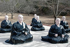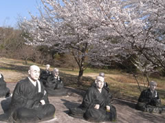 ▲五色園には等身大よりやや大きい像が100体以上。数体一組でひとつのシーンを成し、広大な園内に24のシーンが点在する 拙著『東海珍名所九十九ヶ所巡り』でも大々的にフィーチャーしている五色園(愛知県日進市)は、親鸞聖人の生涯や教えにまつわるエピソードを実物大の野外人形彫刻によって伝える、国内でも例を見ない非常に珍しい宗教テーマパークです。広大な園内には、僧侶をはじめとする約2mもの人形彫刻が100体以上も林立しています。