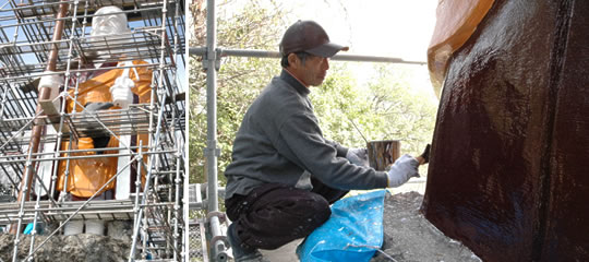 ▲井嶋氏による愛宕山弘法大師像の修復作業風景