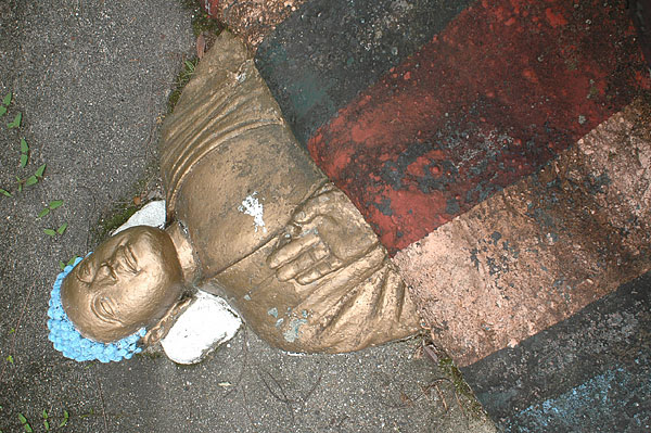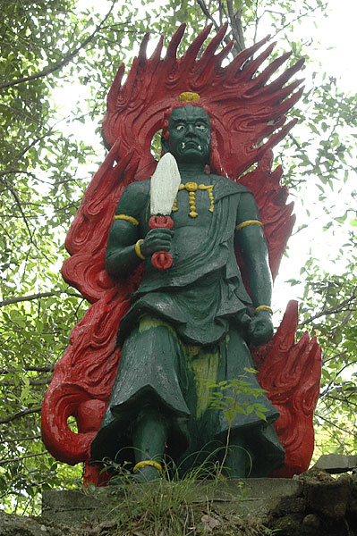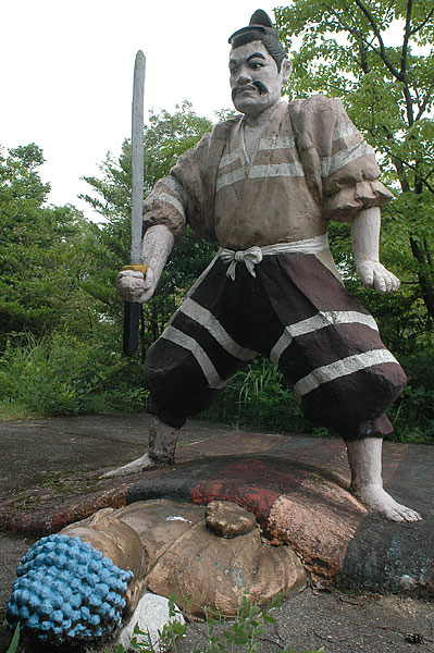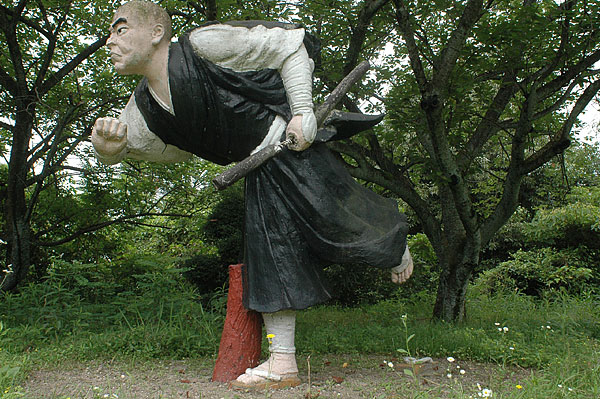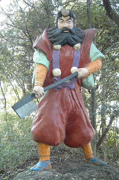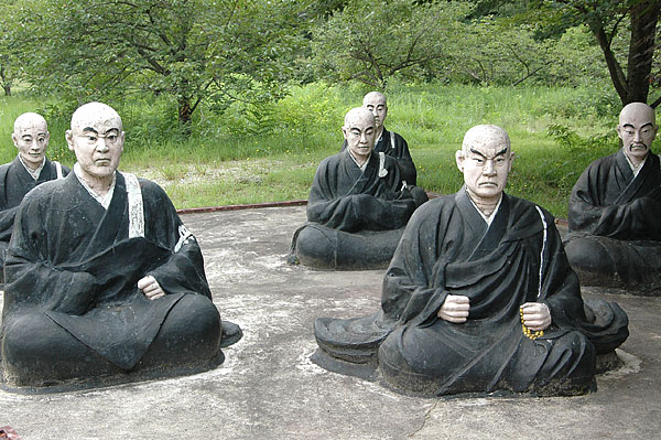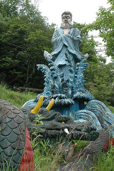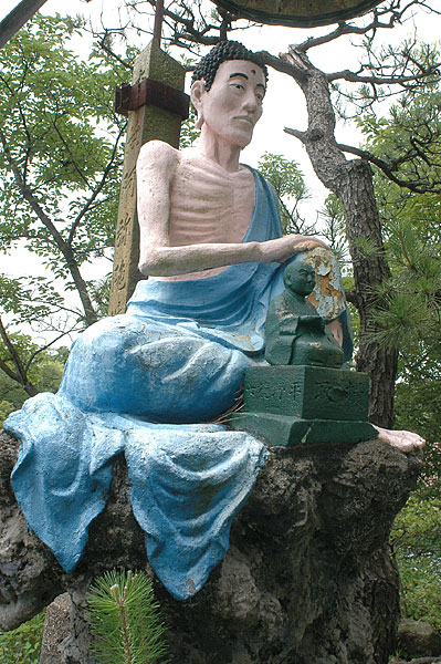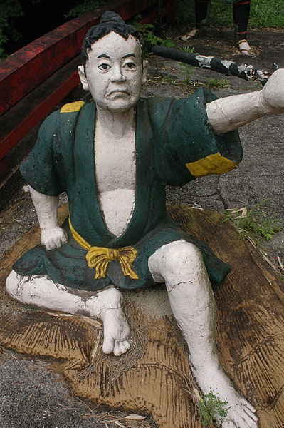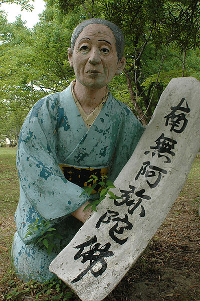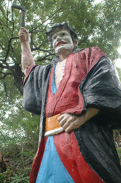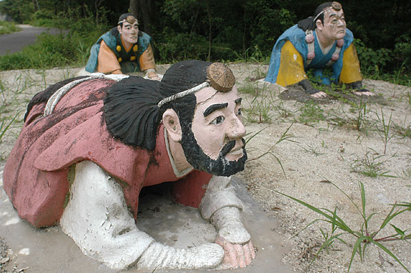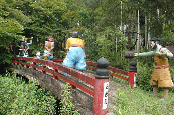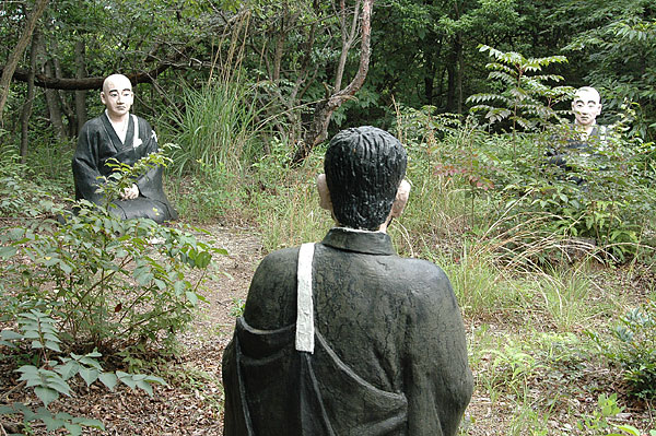 五色園は大安寺というお寺の広大な敷地内に設けられた、日本初にして唯一の宗教テーマパーク。そして、その主役が100体以上ものコンクリート製の坊さん、武士らの人形群。これこそ浅野祥雲さんが、初めてテーマ性をもとに大量の人形を手がけた金字塔的施設なのだ!